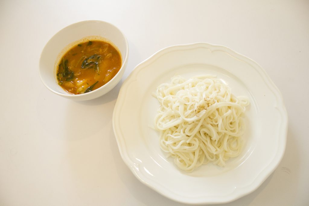 ココナッツミルク、鶏ガラスープ、片栗粉、うどん
