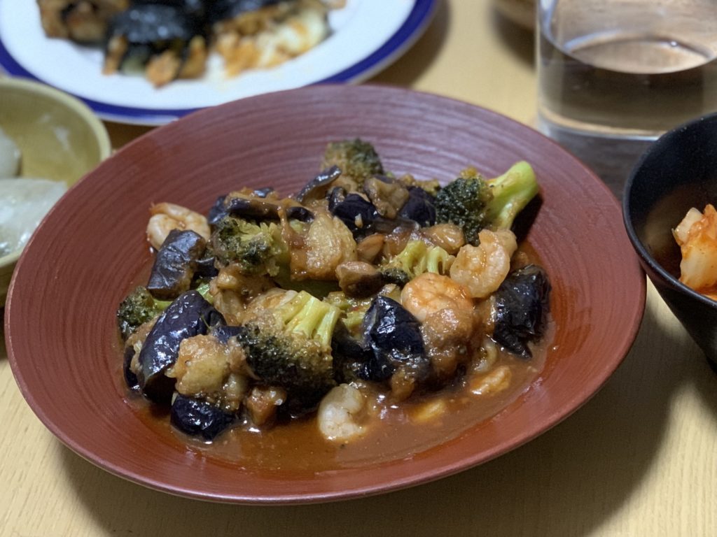 冷凍ナス、冷凍ブロッコリー、冷凍しておいた期限切れのむきえび、チリソース、ケチャップ、醤油、すりおろしニンニク、生姜、砂糖