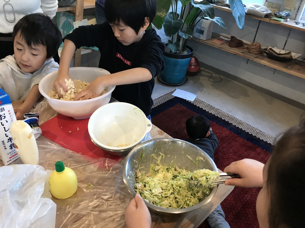 キャベツの水を絞る作業が子どもたちに人気。ハンバーガーにピッタリのつけ合せになりました。