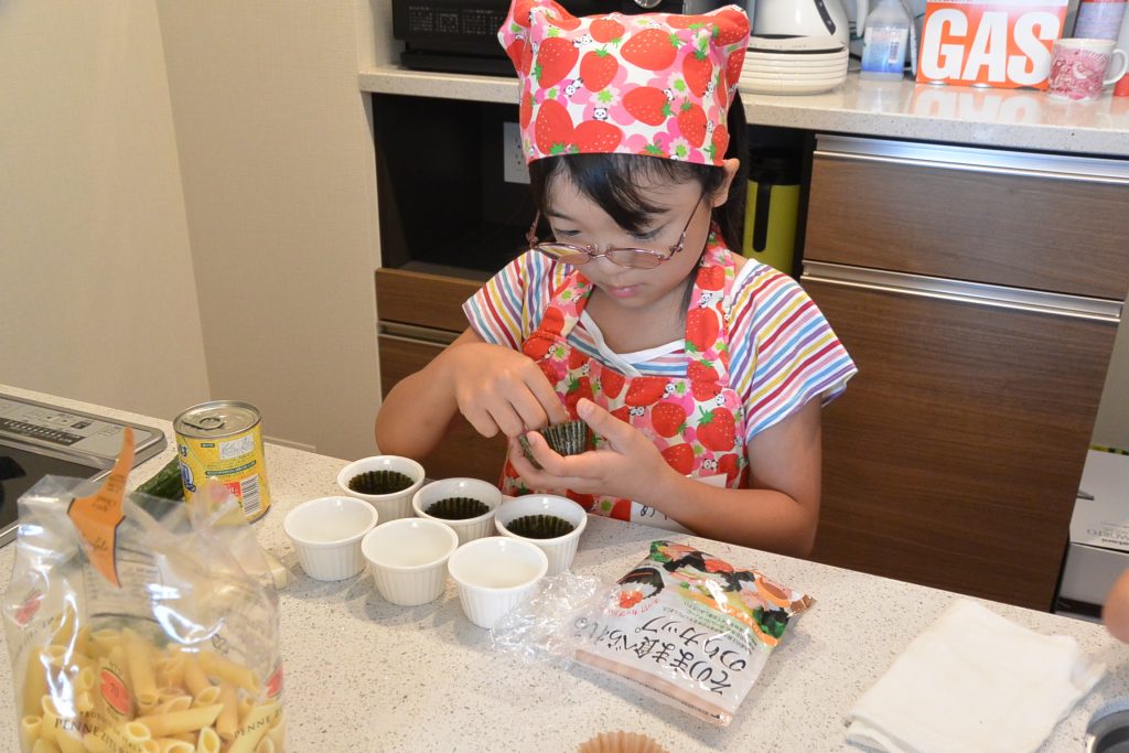 3年生の女の子のオリジナル料理です。のりカップの中に、きゅうり・コーン・おもちが入っています。大人には思いつかない盛り付けですね。