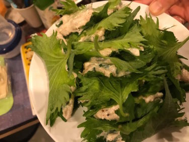 クリームチーズにほぐした明太子、レモン果汁、藻塩、ブラックペッパーを混ぜ込んたものに、太めの千切りにしたきゅうりと絡め、手でもパッも食べやすいように大葉で包んでみました。