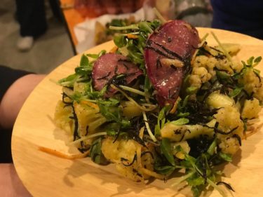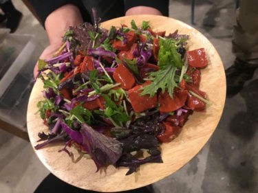 シェフが持ってきた赤こんにゃくを余った野菜と白味噌とごま油で、お酒のアテにもぴったりのサラダにしました。
