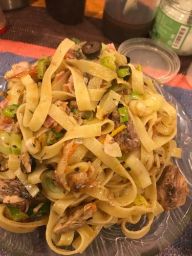 タリアッテレを固めに湯がき、冷蔵庫で熟したトマト、ブラックオリーブ、長ネギ、にんにくでソース作り、仕上げにサバのオリーブオイル煮でサクッと混ぜ合わせた簡単オイルパスタ。