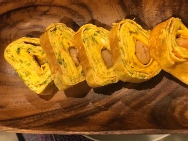 だしの代わりにかつお節、あおさを混ぜ込み、明太子をくるくる何重にも巻き付けた卵焼き。