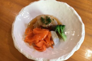 豚角煮と人参きしめん。人参をピーラーで剥いて、茹でたものをあんに絡めて添えました。いつもと違う形に変身することで、みためも味も食感も新しい。麺みたいでおいしいと好評。