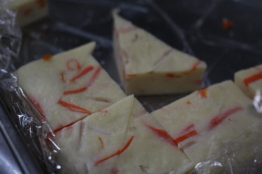 にんじんしんじょ:人参の千切りと紅生姜。すり身に混ぜ合わせてあげました。