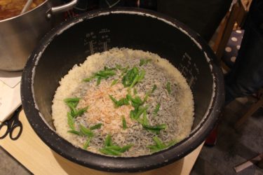 じゃことインゲンをたっぷり混ぜました。じゃこのうま味と塩味、インゲンの鮮やかな緑色とシャキシャキした食感も加わり、より一層美味しくなりました。